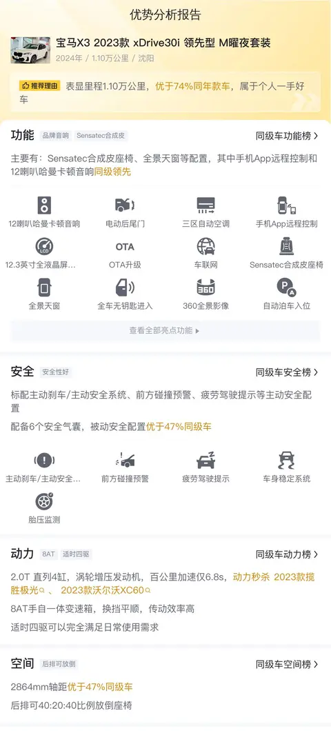 在与同级别竞品车型的对比中,宝马X3在动力性能、内饰品质、品牌价值等方面具有一定的优势。其2.0T发动机的出色表现和xDrive系统的稳定性受到了消费者的认可。同时,宝马品牌的高端形象和良好的保值率也是其优势之一。然而,也有消费者反映宝马X3的内饰设计相对简单,缺乏豪华感;悬架较硬,影响了乘坐的舒适性;此外,与同级别竞品车型相比,宝马X3的配置相对较少,尤其是中低配车型,缺乏一些实用配置。