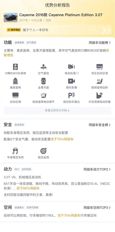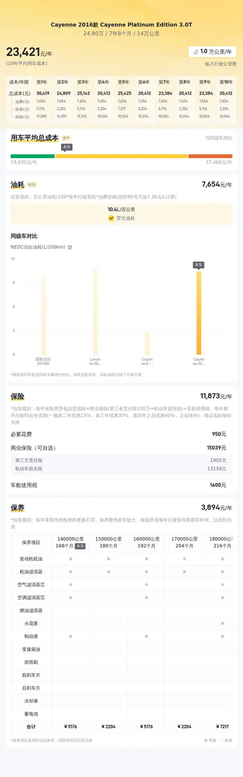 根据大数据统计的市场行情显示,这辆Cayenne的二手行情大致在24.2万至30.7万之间,具体的价格因车况而有所不同。在用车成本方面,根据估算,这辆车的年均综合用车成本在2.3万元左右,当然具体用车成本金额还是根据车辆的实际使用情况而决定的。