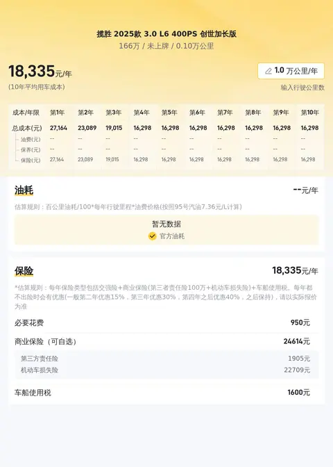 根据相关数据测算,这款二手路虎揽胜的10年平均用车成本约为218088元/年,油料成本约20161元/年,保险费用约37838元/年,保养费用约1989元/年。实际费用根据使用情况而有所不同。
