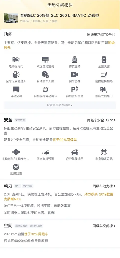 综上所述,这辆二手奔驰GLC 2019款 GLC 260 L 4MATIC 动感型在车况、配置、性能以及市场行情等方面均表现出色。它不仅拥有优雅的外观和精致的内饰,还具备出色的驾驶性能和舒适的乘坐体验。作为一款豪华SUV,奔驰GLC 2019款 GLC 260 L 4MATIC 动感型在二手车市场上具有较高的性价比和竞争力。