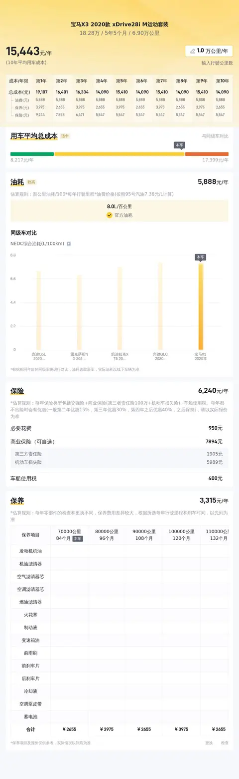 用车成本部分,这辆车的官方百公里油耗为8.0升,根据用户反馈,实际油耗可能在8.5升左右。保险费用大约为6245元/年,保养费用约为3370元/年,年均用车成本约为16060元/年,不过用车成本跟车主的用车习惯也有直接关系。