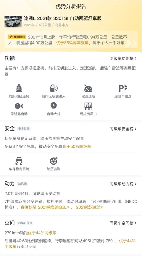 选择购车不仅要考虑车型本身的性能和配置,还要对比同级别竞品的表现。为此,我们挑选了几款与途观L 2021款 330TSI 自动两驱舒享版相似的车型,并在安全性、动力性能、空间舒适性和智能化设施等方面进行了细致对比。尽管途观L在某些方面稍显不足,但它在安全性上的出色表现使其能够与竞品相媲美甚至超越它们。希望这一分析能为您的购车之旅提供有价值的参考,帮助您做出更加明智的决策。