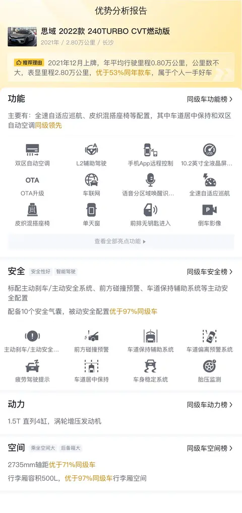综上所述的新车含税价、用车成本、市场行情、优势分析、同款比价等数据仅供参考。在配置部分,因为二手车非标品,车辆可能会存在配置改装的情况,具体车况信息需要线下结合车辆实际情况进行综合参考。