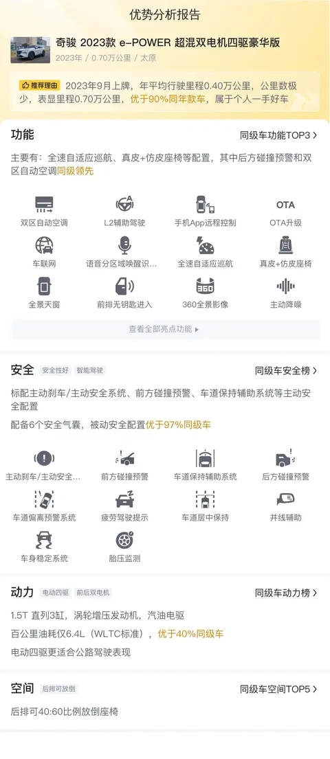 综上所述的新车含税价、用车成本、市场行情、优势分析、同款比价等数据仅供参考。在配置部分,因为二手车非标品,车辆可能会存在配置改装的情况,具体车况信息需要线下结合车辆实际情况进行综合参考。