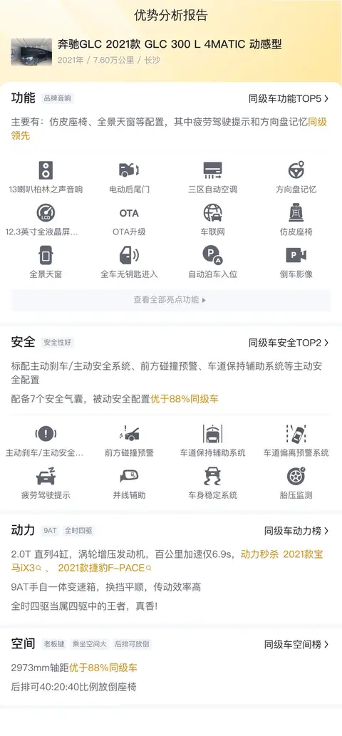 综上所述,这辆奔驰GLC 2021款 GLC 300 L 4MATIC 动感型是一款集豪华、动力、空间于一体的二手车。它不仅拥有奔驰品牌的强大背书,还具备了丰富的配置和出色的性能。作为一款二手车,它的价格相比新车更为合理,且车况良好,是一款值得考虑的车型。如果你正在寻找一款既能满足日常出行需求又能提升生活品质的SUV,那么这辆奔驰GLC 2021款 GLC 300 L 4MATIC 动感型将是一个不错的选择。它能为你带来舒适的驾乘体验,还能提升你的社交形象和生活质量。不妨亲自试驾体验,感受它的独特魅力。