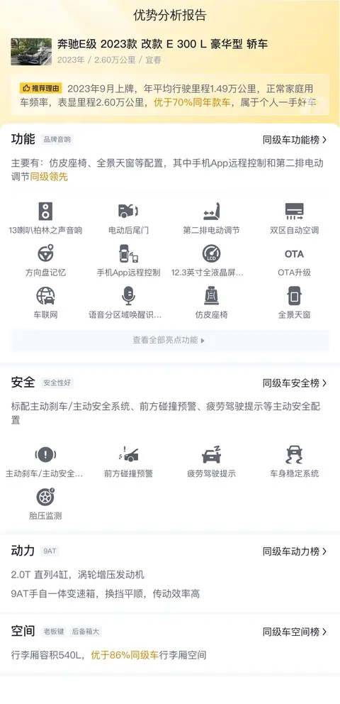奔驰E级(图片|配置|询价)车系一直是高端商务轿车市场的旗舰之一,以其一贯的豪华、舒适和科技感吸引着众多商务人士。2023款改款E 300 L 豪华型作为车系中的高端配置车型,自然继承了这一优良传统,并在细节上进行了升级。这款车的新车指导价为50.41万元,目前二手车市场上,有一辆行驶了2.6万公里的宜春牌照黑色奔驰E级 2023款 改款 E 300 L 豪华型轿车,报价为37.48万元。接下来,我们将深入剖析这辆车的优缺点,看看它是否真的物有所值。
