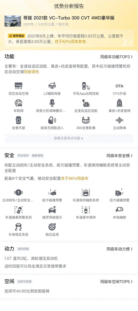综上所述的新车含税价、用车成本、市场行情、优势分析、同款比价等数据仅供参考。在配置部分,因为二手车非标品,车辆可能会存在配置改装的情况,具体车况信息需要线下结合车辆实际情况进行综合参考。