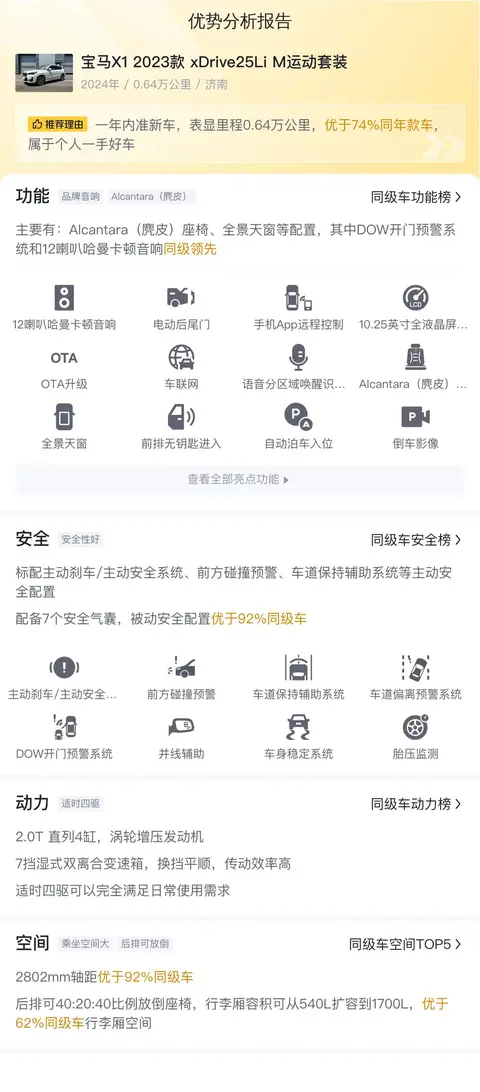 2023款宝马X1 xDrive25Li M运动套装在外观和设计方面表现出色为驾驶者带来了强烈的视觉冲击力和动感气息。在动力和性能方面它搭载了2.0T涡轮增压发动机和7挡双离合变速箱提供了强劲的动力输出和高效的燃油经济性。内饰方面采用了Alcantara(麂皮)材质座椅和全景天窗等配置为乘客提供了舒适和宽敞的乘坐体验。市场行情方面这款车的售价通常在20万左右作为一款个人一手好车它不仅继承了宝马品牌的卓越品质更有着非常实惠的价格。在用车成本方面它的百公里油耗约为7.6升(WLTC标准)同时还配备了多种智能驾驶辅助系统和安全配置。所有这些因素都使得宝马X1 xDrive25Li M运动套装成为了一款值得推荐的二手车选择。如果您正在寻找一款高品质、高性价比的二手车不妨考虑一下这款宝马X1 xDrive25Li M运动套装吧!
