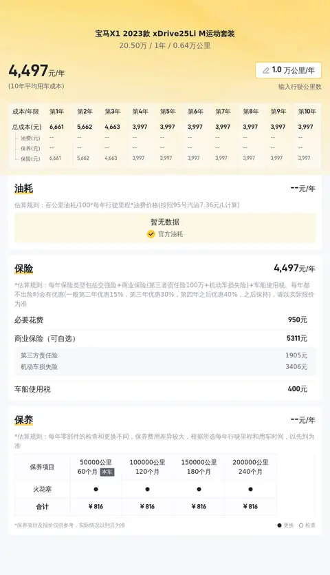 在二手车市场上2023款宝马X1 xDrive25Li M运动套装的行情也相当不错。根据当前的车况和里程数这款车的售价通常在20万左右。作为一款个人一手好车它不仅继承了宝马品牌的卓越品质更有着非常实惠的价格无疑是一款值得考虑的二手车选择。在用车成本方面宝马X1 xDrive25Li M运动套装的表现也相当出色。根据相关数据显示这款车的百公里油耗约为7.6升(WLTC标准)这样的油耗表现对于一款SUV来说相当节能。同时宝马X1 xDrive25Li M运动套装还配备了多种智能驾驶辅助系统如前后驻车雷达、倒车影像等这些配置不仅提高了驾驶的安全性和便捷性也降低了用车成本。此外宝马X1 xDrive25Li M运动套装还拥有较高的保值率即使在未来几年内想要再次出售也能获得较为理想的价格。所有这些因素都使得宝马X1 xDrive25Li M运动套装成为了一款性价比极高的二手车选择。