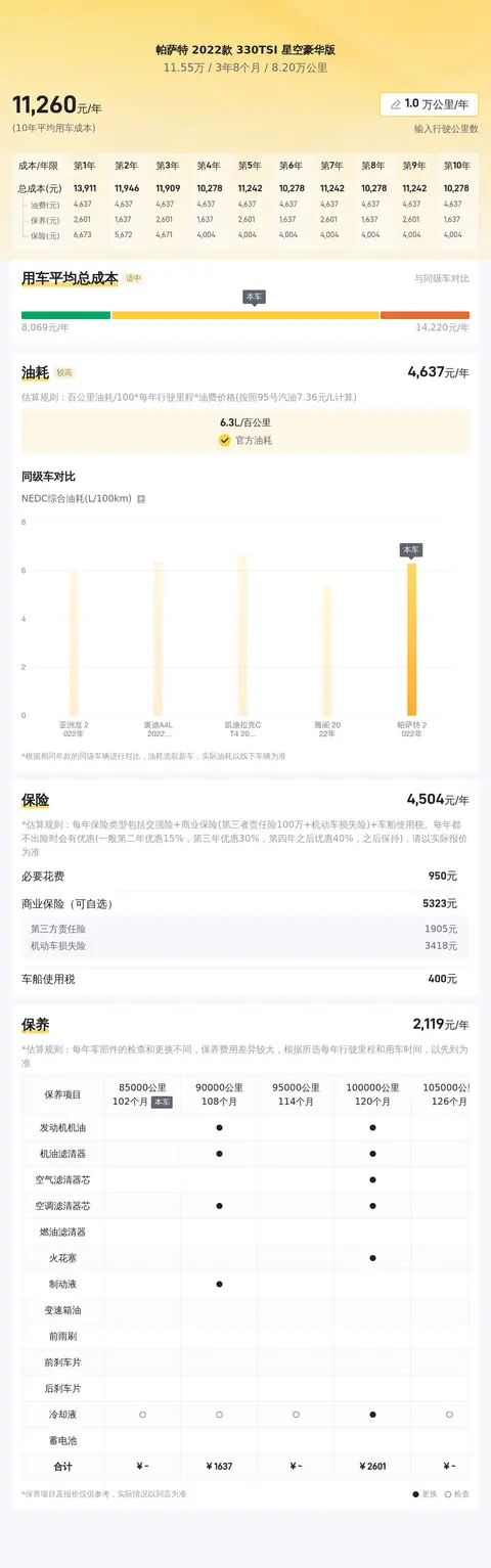 这台车按每年行驶一万公里计算,燃油费用约5653元,保险费用约4380元,保养费用约973元,平均年度用车总成本约11006元,用车成本与同级车相比处于中等偏下水平,性价比还是不错的。