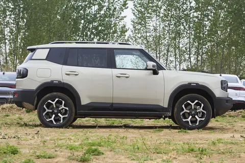 车身侧面,平直线条勾勒出硬朗的姿态,悬浮式车顶增加了一些现代美学元素。宽厚的轮眉略微凸出车身,多段式腰线让侧面看起来更灵动。车门下方有粗壮的黑色护板和脚踏板,不仅能保护车身漆面,上下车也更方便,尤其是对老人和身材较矮的人来说很实用。不过方盒子造型虽然好看,但在一些狭窄的停车位停车时,可能需要多调整几次角度。