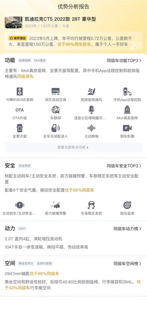 据估算,同级车的最低用车成本是6509元/年,最高是15798元/年,凯迪拉克CT5 2022款 28T 豪华型是13132元/年,用车成本适中。