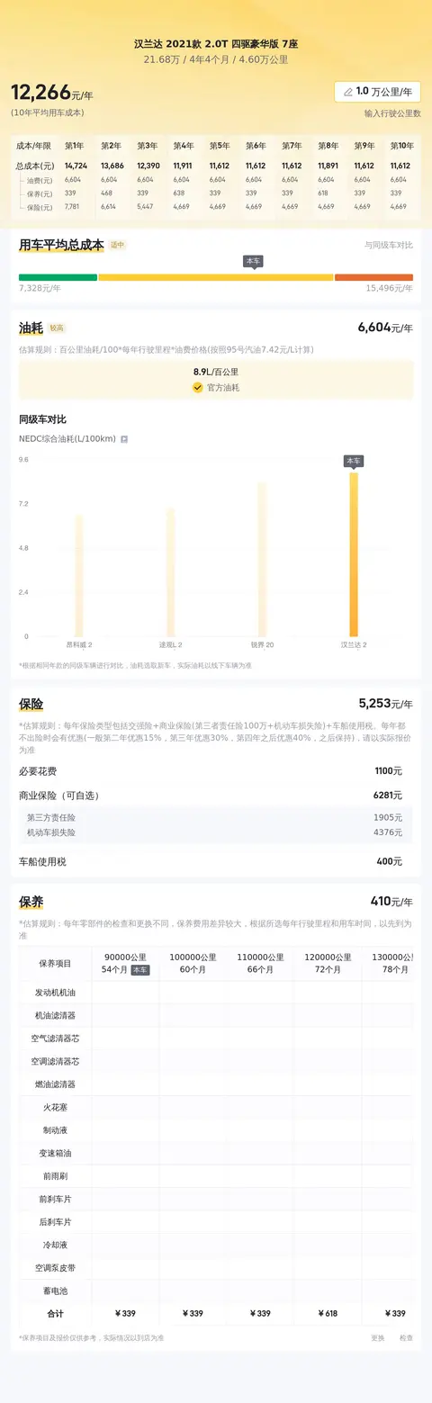 这辆车年均综合用车成本约12575元,其中包括油费约7111元,保险约4064元,保养400元(以上数据仅供参考)。