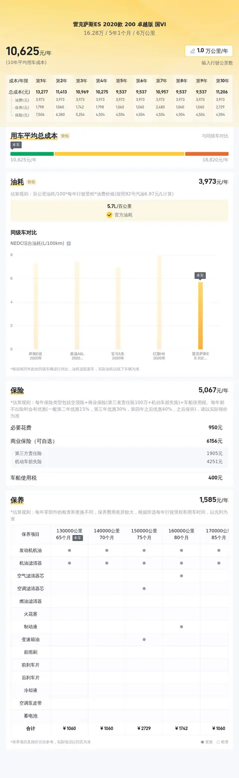 雷克萨斯ES 2020款 200 卓越版 国VI的10年平均用车成本是11449元/年,算是正常水准。官方公布的油耗是5.7L,也低于同级车的油耗标准,所以,整体的用车成本并不算高。