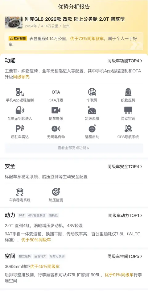 综上所述,在车况部分,除了外观、内饰功能的检测,更多买家关注的是这辆车是否为“三非”车辆,三非就是指非重大事故、非火烧、非水泡。因为事故车、泡水车、火烧车都存在较大的安全隐患。不过您放心,这辆车已经通过了事故检测、火烧检测和泡水检测,可以确定它非重大事故车、非火烧车、非泡水车。在配置部分,全速自适应巡航、车道居中保持等多项主动安全配置,为驾驶者提供全方位的安全保障。同时,车内还设有6个安全气囊,被动安全配置优于62%的同级车型,为乘客提供更加安心的乘坐体验。在动力部分,2.0T直列4缸,涡轮增压发动机,以及9AT手自一体变速箱,实现平顺而有力的动力输出。官方数据显示,百公里加速时间为9.5秒,WLTC综合油耗为7.85升/百公里,兼顾了动力性能与燃油经济性。在市场行情部分,本车的售价不仅处于合理区间内,更是节省了6.31万的购车成本。希望该分析能够在您选购车型的时候有所帮助哦~
