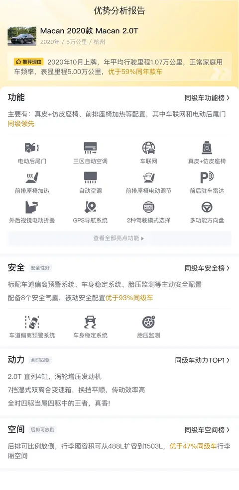 这辆Macan 2020款 Macan 2.0T,年均综合用车成本是15181元,这是在一个合理的区间范围内,毕竟这么大排量的发动机,需要多吃点“草”。