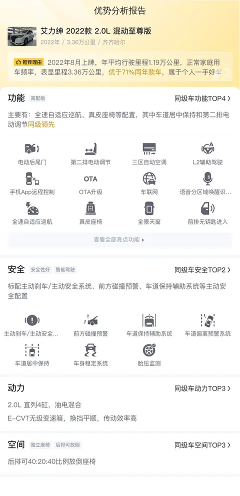综上所述的新车含税价、用车成本、市场行情、优势分析、同款比价等数据仅供参考。在配置部分,因为二手车非标品,车辆可能会存在配置改装的情况,具体车况信息需要线下结合车辆实际情况进行综合参考。
