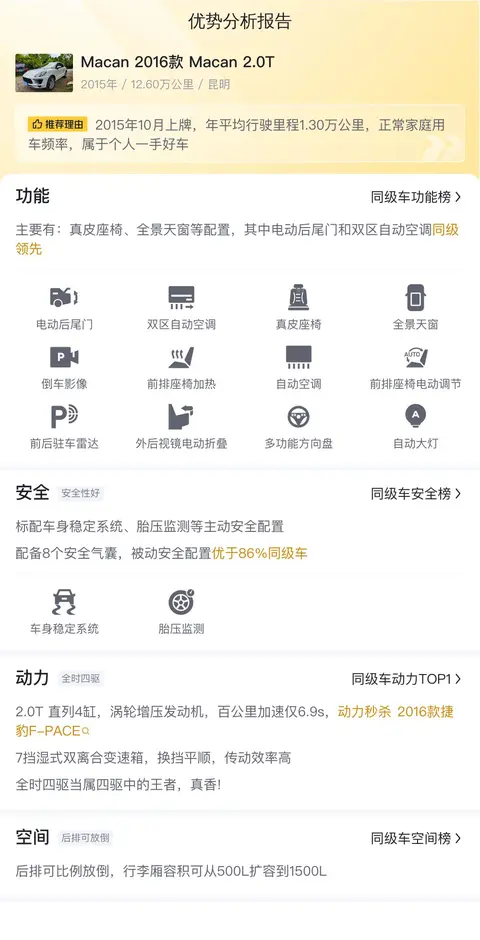 优势方面,这辆Macan 2016款 Macan 2.0T的发动机数据以及百公里加速成绩放在如今依旧能打!作为一台2.0T的发动机能够爆发出237匹马力已经是相当不错的动力储备了,更难能可贵的是这台小排量发动机还兼顾了燃油经济性,官方给出Macan 2016款 Macan 2.0T的百公里油耗为10L,当然如果暴力驾驶肯定不止这个数啦~但也能看出这台发动机的热效率是比较高的。