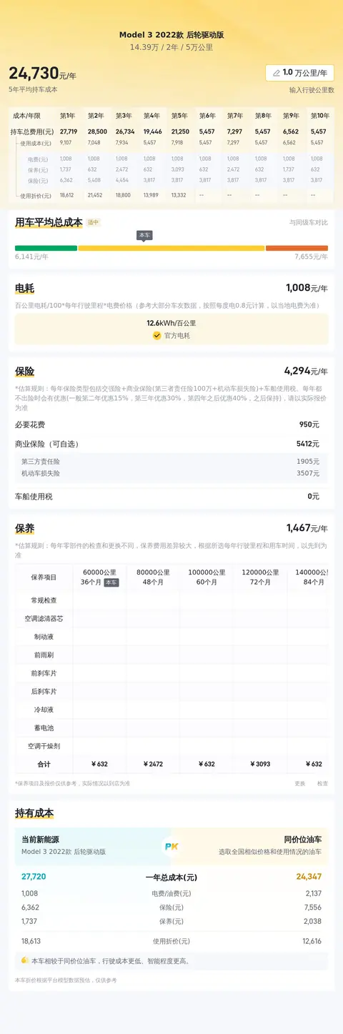 在用车成本方面,Model 3同样表现出色。按照每年行驶1万公里计算,其平均使用成本约为25487元,这一数字涵盖了电费、保险费及保养费等各项支出。相比许多同级别燃油车型,Model 3在使用经济性上显然更具优势。