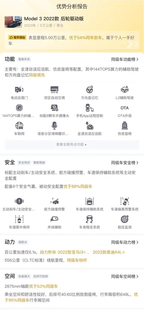 为了帮助您更清晰地了解这辆Model 3在市场中的竞争力,我们对其安全特性、动力性能以及内部空间等方面的功能配置进行了详细对比分析。通过与同级别车型的横向比较,您将能够更加直观地感受到这辆Model 3的独特魅力与价值所在。