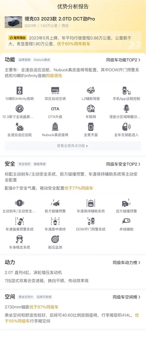 综上所述的新车含税价、用车成本、市场行情、优势分析、同款比价等数据仅供参考。在配置部分,因为二手车非标品,车辆可能会存在配置改装的情况,具体车况信息需要线下结合车辆实际情况进行综合参考。
