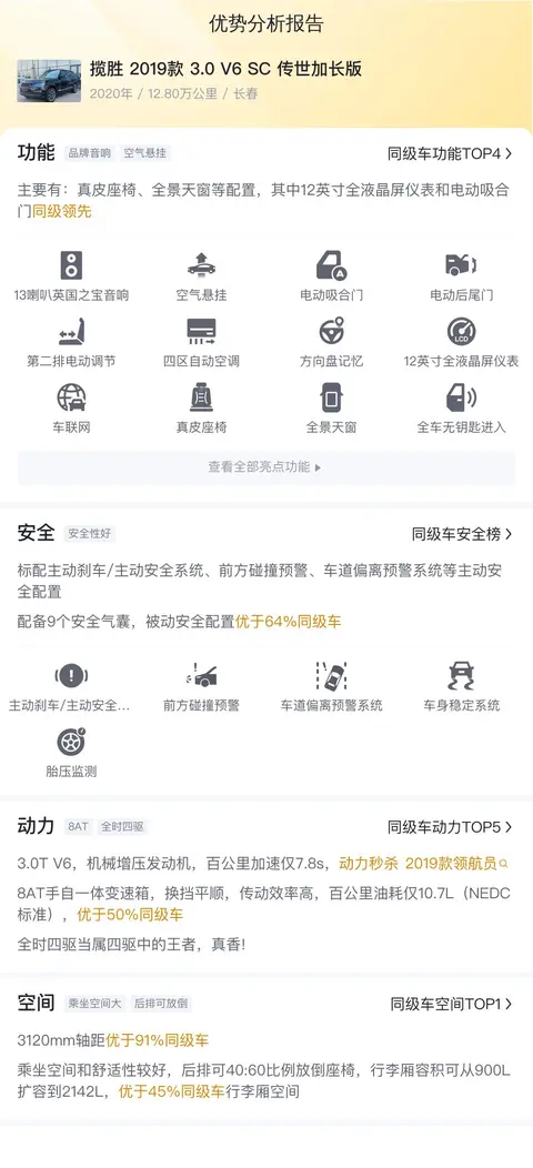 综上所述的新车含税价、用车成本、市场行情、优势分析、同款比价等数据仅供参考。在配置部分,因为二手车非标品,车辆可能会存在配置改装的情况,具体车况信息需要线下结合车辆实际情况进行综合参考。