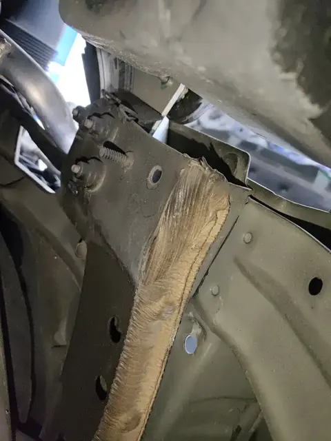 在事故检测中,本车的水箱框架有更换,右车顶边梁有喷漆修复,左前翼子板内衬有变形。