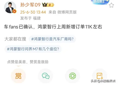 鸿蒙智行第4周(6.23-6.29日)新增订单11000台左右,环比第3周增加1500台。目前鸿蒙智行旗下会受到小米YU7冲击的车型有智界R7(图片|配置|询价),不过智界目前每周的销量表现一般,对鸿蒙智行整体销量起不到决定性作用。
