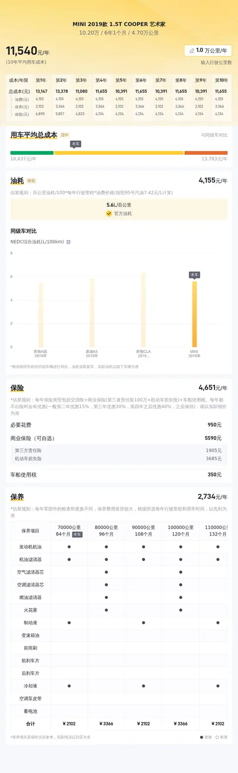 根据大数据分析,这辆二手MINI的售价区间应为11.75万至14.57万元,而当前车主的报价为10.2万元,相较于市场行情,这是一个极具竞争力的价格。在用车成本方面,根据估算,这辆车的年均综合用车成本大约为1.2万元左右,这对于一辆配置丰富且性能卓越的车型来说,是一个合理的支出水平。