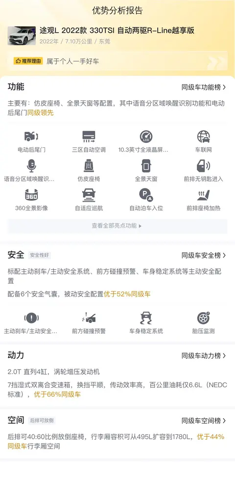 综上所述,这辆二手途观L 2022款 330TSI 自动两驱R-Line越享版凭借其出色的性能、宽敞的空间、精致的内饰以及合理的价格,成为了众多消费者心中的理想之选。如果您正在寻找一款性价比高的中型SUV,那么这辆途观L绝对是一个不错的选择。目前该车售价12.98万元,支持分期付款,首付不到4万就能开回家,对于预算有限的消费者来说,无疑是一个很好的选择。同时,作为一款二手车,这款车也具有一定的保值潜力,可以在未来几年内为车主带来稳定的资产价值。总的来说,如果您正在寻找一款性价比高、性能出色的中型SUV,那么这辆途观L绝对是一个值得考虑的选择。
