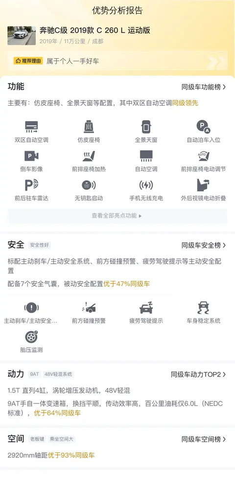 奔驰C级2019款 C 260 L运动版拥有仿皮座椅、全景天窗等配置,其中双区自动空调同级领先。从动力方面来看,1.5T 直列4缸,涡轮增压发动机,48V轻混,9AT手自一体变速箱,换挡平顺,传动效率高,百公里油耗仅6.0L(NEDC标准),优于64%同级车。在空间方面,2920mm轴距优于93%同级车。