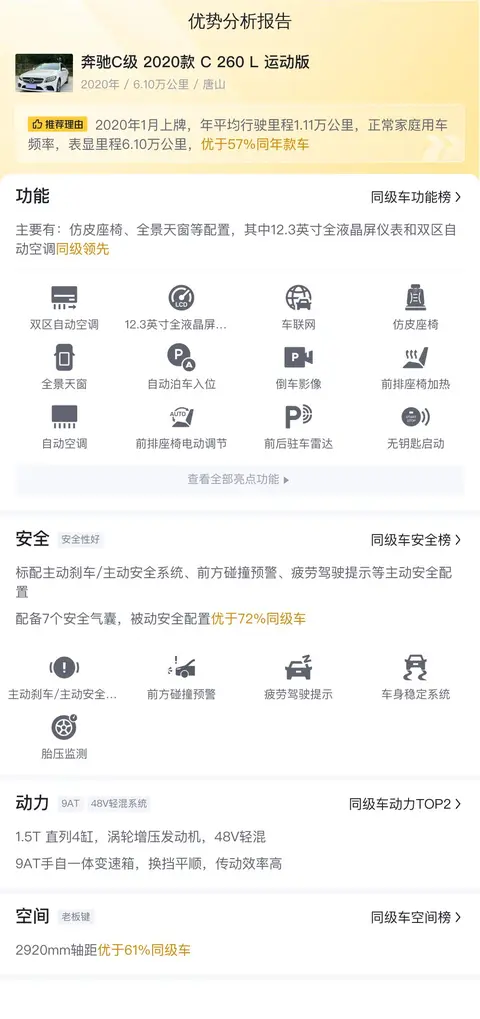 购买二手车时,车况始终是买家最关心的点。这辆奔驰C级2020款C260L运动版车况非常不错,车源地与上牌地均为唐山,只行驶了6.1万公里,车身颜色为白色,仅过户了一次。更重要的是,它已获得了懂车帝的质量认证,这意味着它已经过全面严格的检测,无重大事故、非火烧、非水泡,且所有瑕疵都会被明确展示出来。您可以完全放心购买!接下来,我们将带您详细了解这辆车的全方位检测报告。