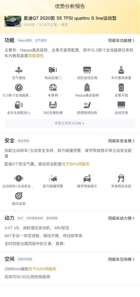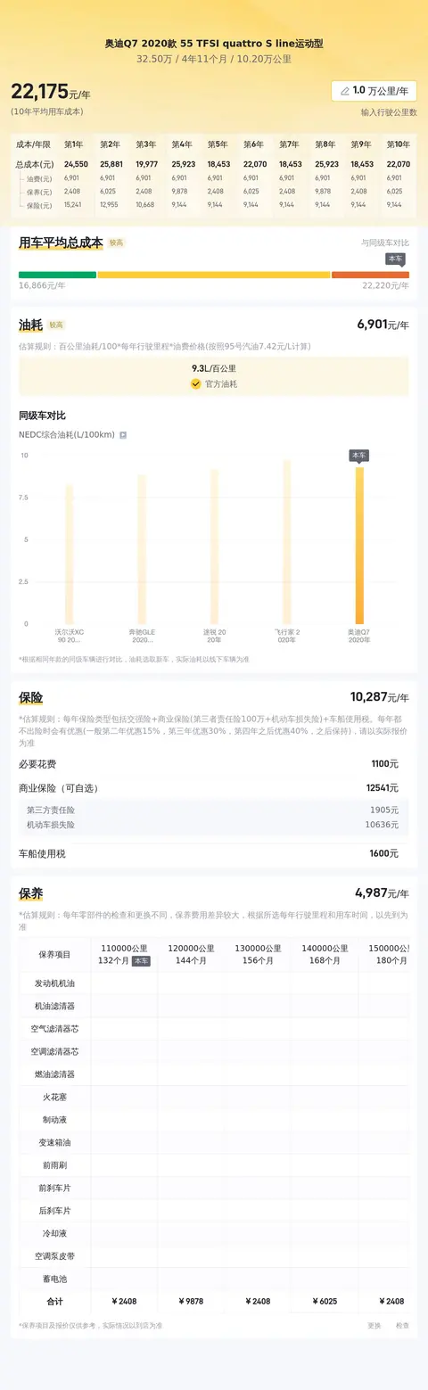 据估算,同级车的最低用车成本是17780元/年,最高是25786元/年,奥迪Q7 2020款 55 TFSI quattro S line运动型是21680元/年,用车成本适中。