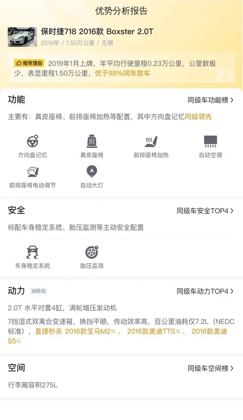 二手车报价是36.80万的保时捷718 2016款 Boxster 2.0T,新车含税价为65.23万,2019年1月首次上牌,在此期间过户2次。