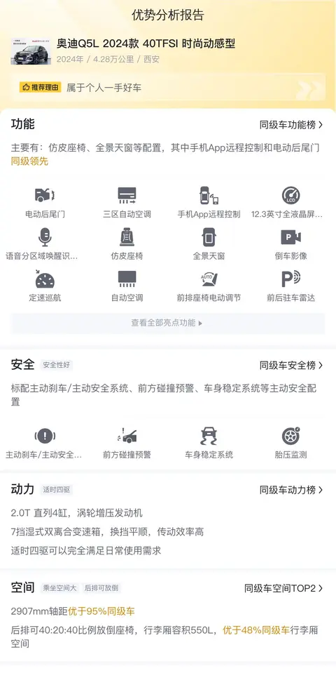 为了更清晰地向消费者展示奥迪Q5L 2024款 40TFSI 时尚动感型在安全性、动力性能等方面的竞争优势,我们特别制定了以下优势分析报告。报告通过与同级别车型的对比,突出了奥迪Q5L在主动安全配置、动力表现等方面的显著优势,为消费者提供了客观、权威的数据支持,帮助他们在选购车型时做出更加明智的判断。