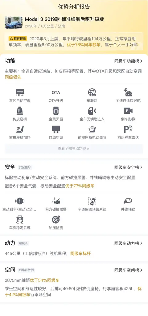 根据懂车帝大数据分析,这辆二手Model 3 2019款 标准续航后驱升级版的售价在10.88万元左右,考虑到其车况良好、里程适中,这一价格在市场上具有一定的竞争力。从用车成本来看,官方公布的百公里能耗为12.4kWh,按每年行驶2万公里计算,电费约为600元,相比燃油车节省不少。此外,电动车的维护成本相对较低,也能为车主节省一笔开支。需要注意的是,作为电动车,Model 3的电池寿命和衰减情况是长期使用中需要考虑的因素。虽然目前没有确切的数据表明电池的更换成本,但特斯拉官方提供了电池和动力系统的8年或16万公里保修,一定程度上缓解了车主的担忧。随着技术的发展和市场的变化,电动车的保值率也可能会受到影响。总体而言,这辆二手Model 3 2019款 标准续航后驱升级版在车况、价格和配置上都表现出了一定的吸引力。