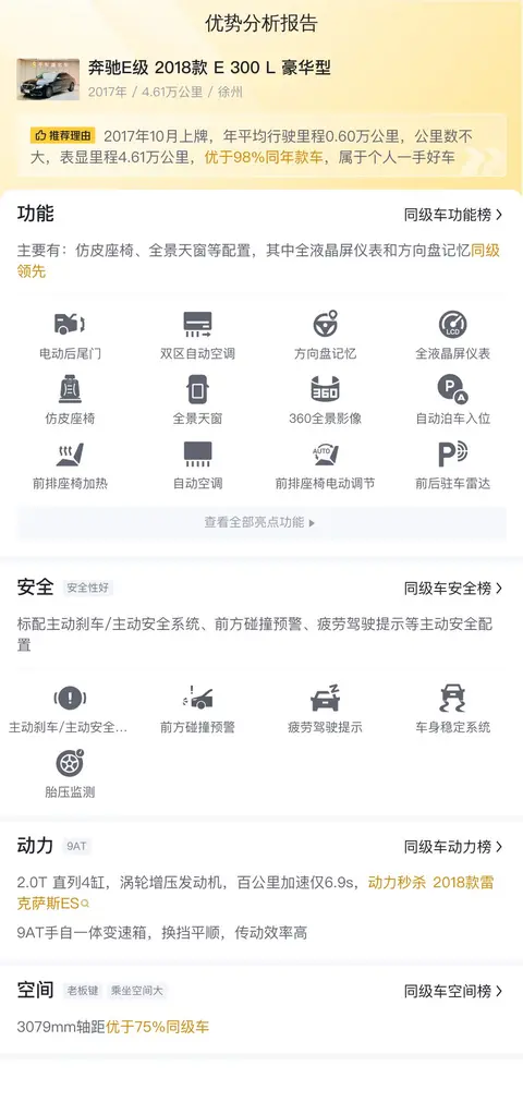 另外,根据估算,同级车的最低10年平均用车成本是13364元/年,最高是18946元/年,奔驰E级2018款 E 300 L 豪华型是15364元/年,也在正常范围内。