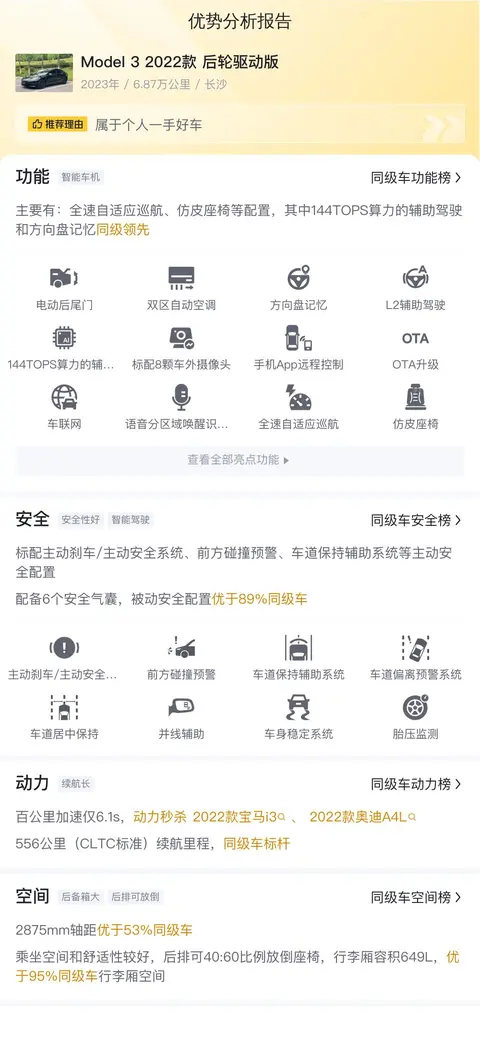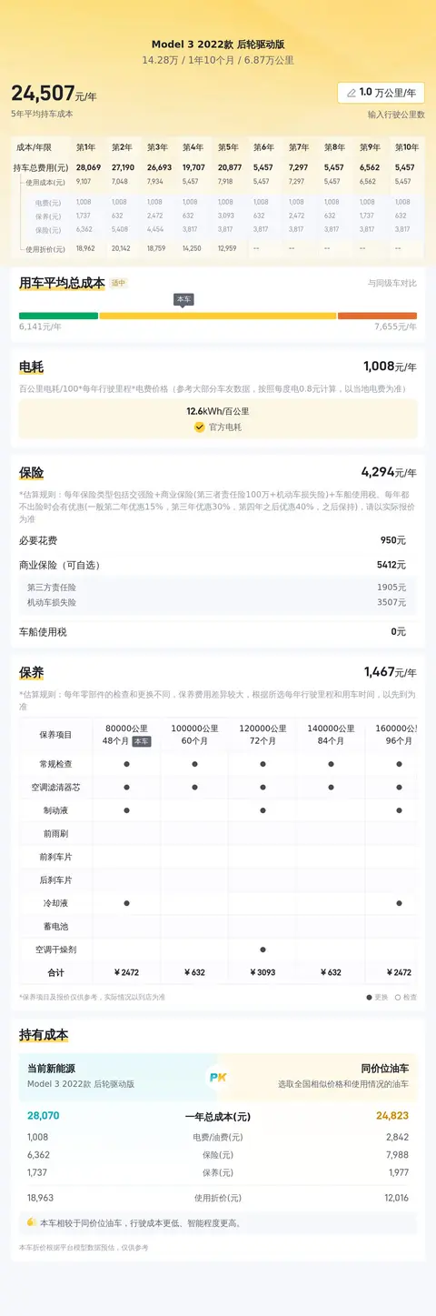 当前市场,这款Model 3的二手车售价在14.04-16.95万元之间。具体售价因车辆条件而异。本车售价14.28万元,车况良好,性价比不错。在用车成本方面,本车百公里电费约12.6元,每年保险费用约4600元,保养费用约4300元,10年平均用车成本约为11151元/年,与同级别车型相比,处于较高水平。这些数据仅供参考,实际费用可能会根据您的车况、驾驶习惯和用车环境等因素有所变化。