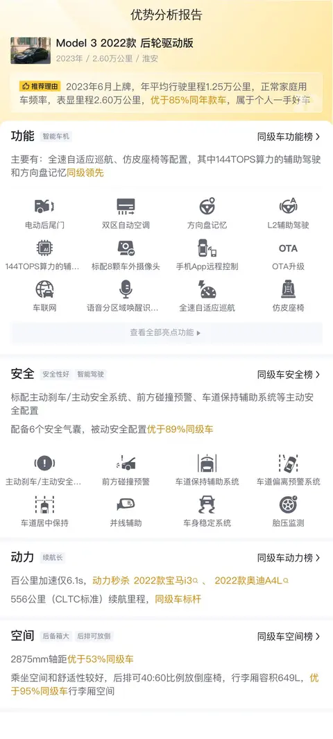 在空间部分,这辆Model 3 的轴距是2875mm,优于77%同级车,后排可40:60比例放倒座椅,行李厢容积649L,优于95%同级车行李厢空间。