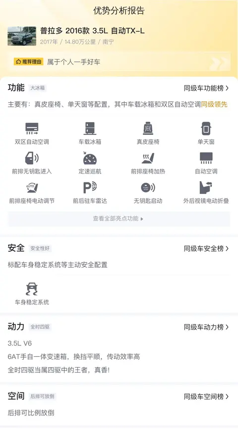 不可否认,普拉多在同级别里面的知名度挺高的,保值率也比较高,就算是十几年的老款,价格也坚挺的很,但这款不一样,价格已经是很接地气了,难得的是虽然是老款,但里程并不多,性能什么的也都是刚刚好,价格却已经是当初的零头,难得。虽说功能配置什么的都一般,但也够用,最重要的还是看喜欢不喜欢了,喜欢越野车的车友,这个车子用着还是很不错的,难得的是价格很给力,算是比较超值了。