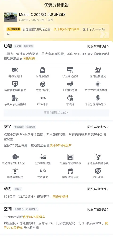 在竞争激烈的二手车市场中,每一款车型都拥有其独特的竞争优势与潜在的局限性。对于这辆二手Model 3 2023款后轮驱动版而言,它的优势主要集中在以下几个方面: