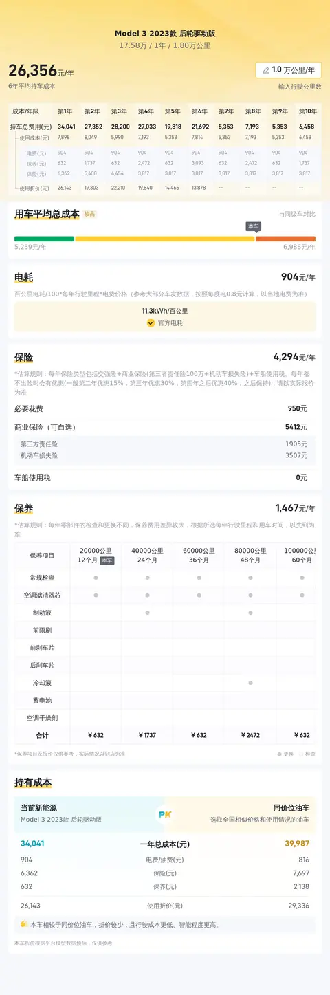 在考虑购买二手Model 3时,除了初始购车成本外,我们还需要关注其长期使用的经济性。通过对大数据的分析,我们可以得出一个大致的预估,即这辆二手Model 3的十年平均用车成本大约在每年2.6万元左右。这一数字涵盖了电费、保险费用以及可能的维修保养成本等各个方面,为消费者提供了一个全面而客观的经济参考。