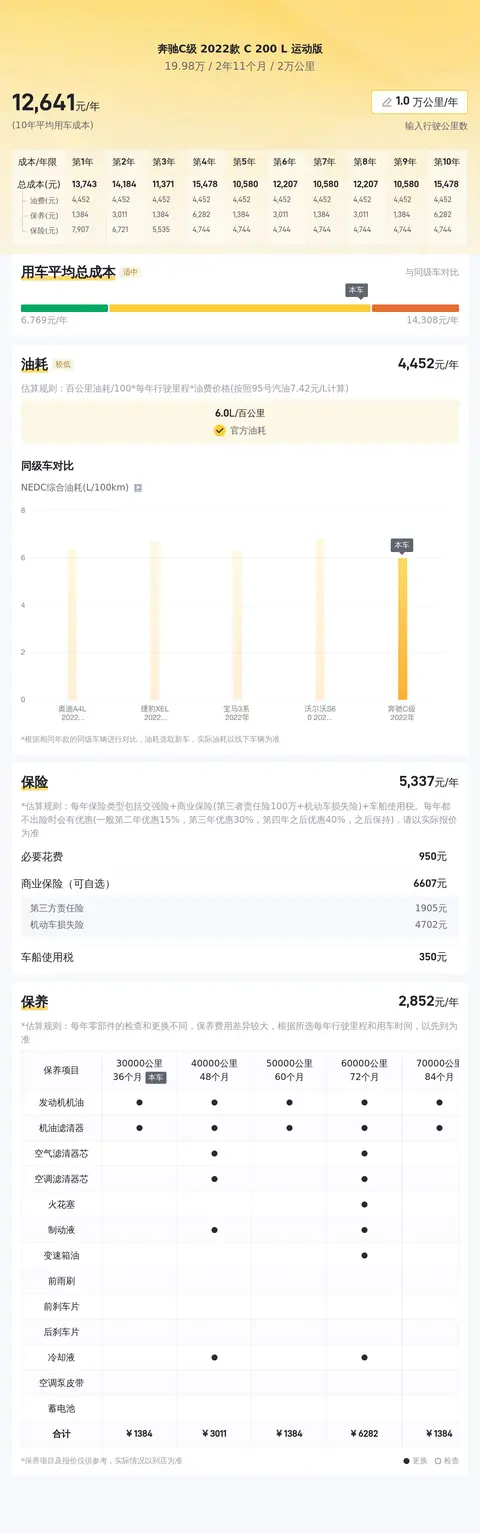 买二手车,咱得看看市场行情,这车啊,在二手车市场上,报价在19.01万到23.04万之间,咱们说的这辆报价19.98万,算是挺实惠的价格了!说到用车成本,官方给出的百公里油耗是6.1L,当然,实际油耗可能会因为你的驾驶习惯和路况有所不同。每年的保养费用大约是4686元,保险费用大约是5682元,这些费用啊,都比同级车要低一些。