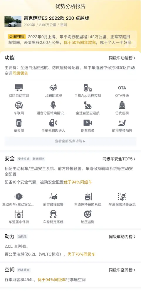 综上所述,这辆2022款雷克萨斯ES 200卓越版是一辆车况良好、配置丰富、性能稳定的中大型轿车。它的主要优势在于舒适的驾乘感受、宽敞的空间以及较低的油耗。然而,它的动力输出相对平缓,对于追求驾驶激情的人来说可能稍显不足;其次,虽然整体车况良好,但也存在一些瑕疵,需要潜在买家在购买前仔细检查和评估。
