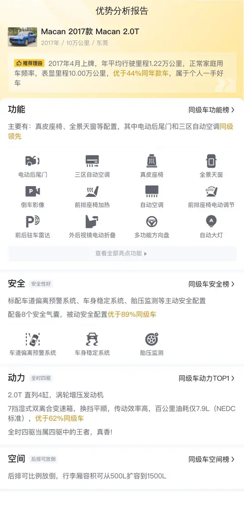 现在,让我们聚焦于这辆二手2017款Macan 2.0T的具体情况。这辆车来自东莞,上牌日期为2017年4月,上牌地为东莞。车辆从未过户,并搭载了符合欧洲V排放标准的发动机。截至目前,该车已行驶10万公里,展现出其持久的可靠性和出色的性能状态。车身颜色为蓝色,为车辆增添了几分时尚与神秘感。
