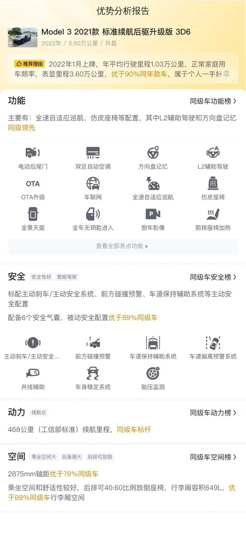 [这辆Model32021款标准续航后驱升级版3D6在动力性能、续航里程、操控感受以及自动驾驶辅助系统等方面表现出色,为驾驶者带来了卓越的驾驶体验。同时,它还具备较高的市场热度和保值率,是一款值得考虑的纯电动车型。