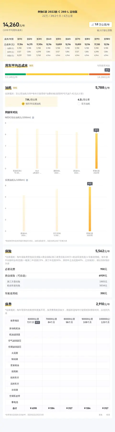 接下来,我们聊聊这款车的用车成本。按照每年2万公里的行驶里程计算,这款车的年均综合用车成本约为14648元。其中,油费约为11460元/年,保险费用约为5668元/年,保养费用约为1698元/年。这些费用在同级别车型中属于合理范围,毕竟养一辆豪车还是需要点银子的。