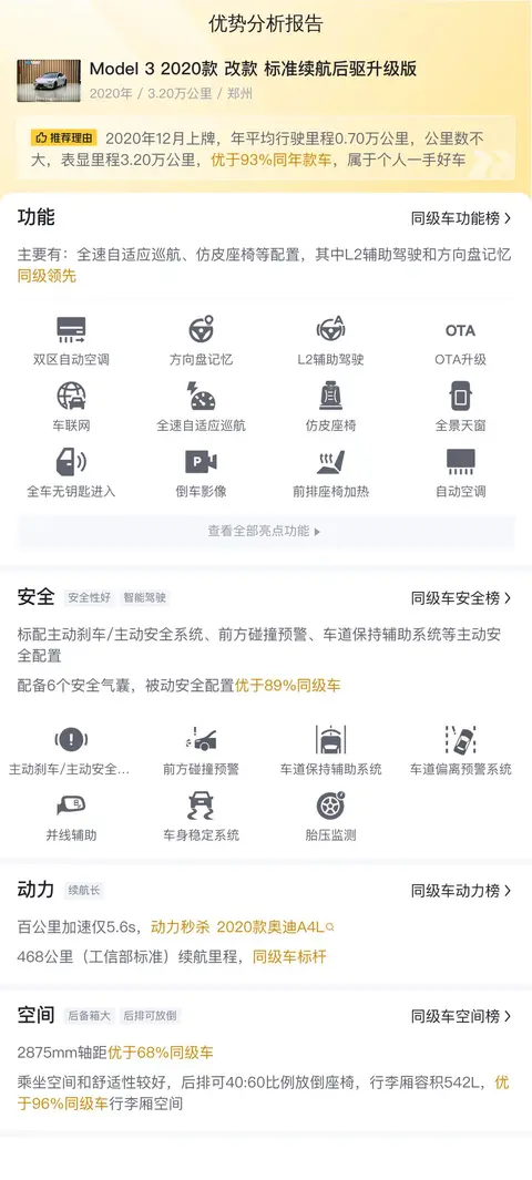 今天给大家带来的这台车是Model 3 2020款 改款 标准续航后驱升级版,首次上牌时间为2020年12月,车源地与上牌地均为郑州,期间0过户,个人家用一手车,截至目前表显里程为3.2万公里,该车新车指导价为26.97万,今天介绍的这台二手车报价11.58万,相对于新车价格便宜了15.39万,性价比还是非常不错的。