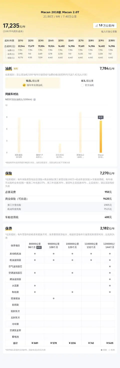根据懂车帝的大数据分析,这辆Macan 2018款 Macan 2.0T的市场价格在19.72万元至23.82万元之间,而其当前报价为21.8万元,处于合理区间内。在用车成本方面,该车10年平均成本约为17180元/年,相较于同级别车型,其燃油经济性和保养费用均表现出色,为车主节省了不少开支。