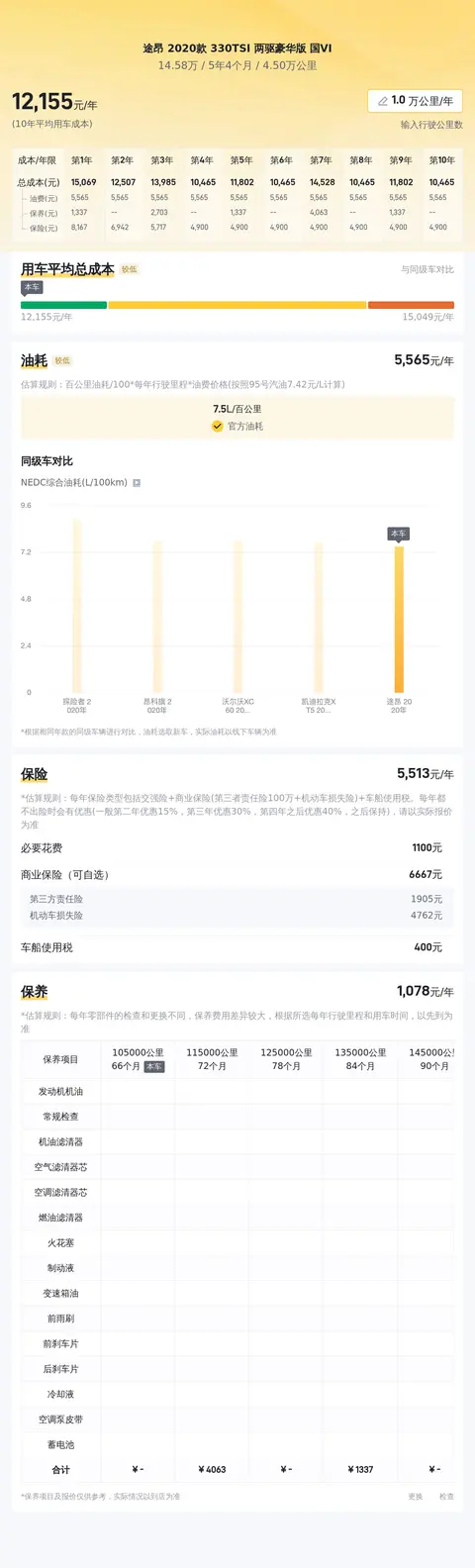 按照该车5年5个月的车龄计算,预计平均每年用车成本约12279元,包括油费约5955元/年,保险约4787元/年,保养约1337元/年,具体费用要看使用情况而定。